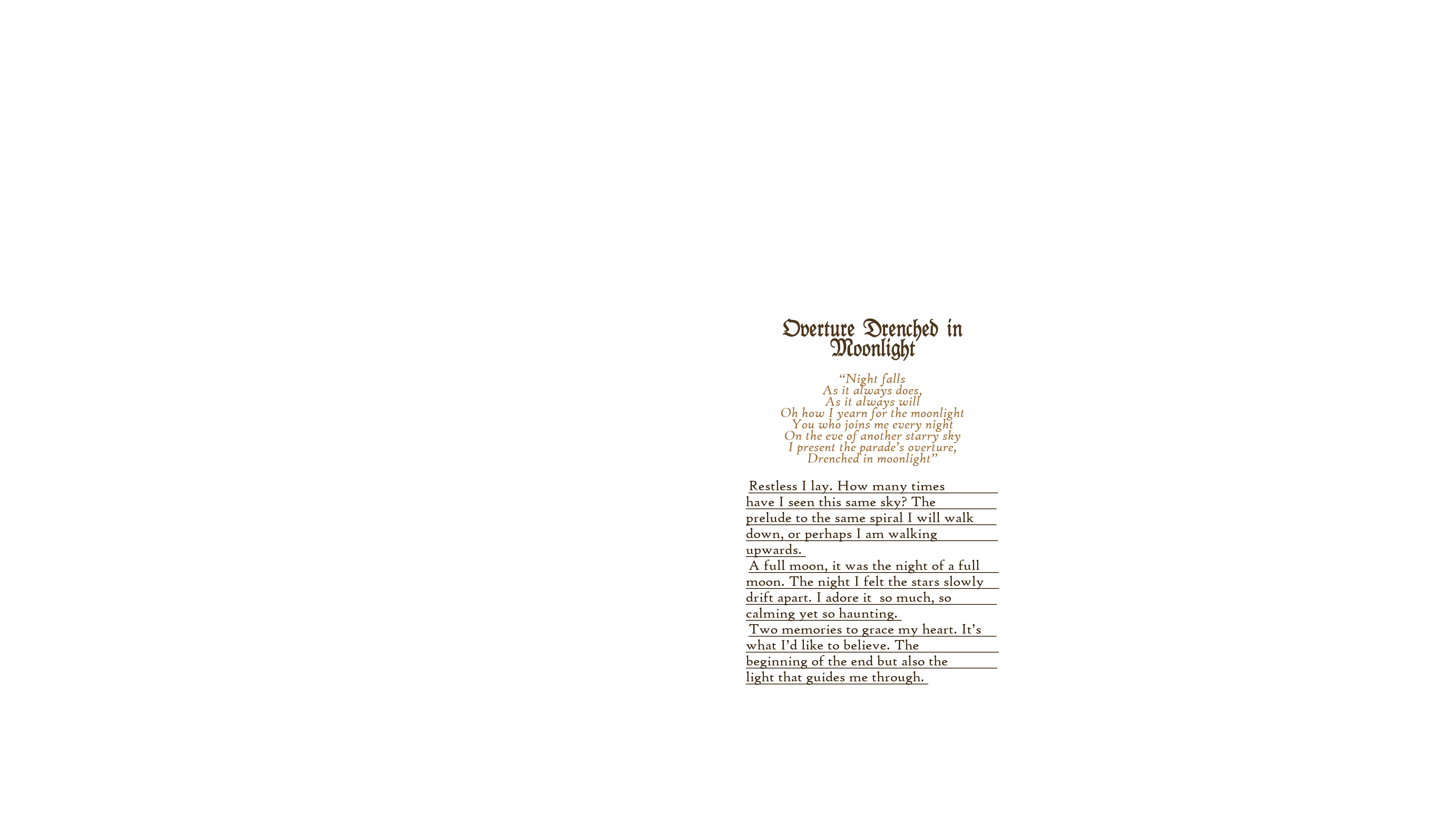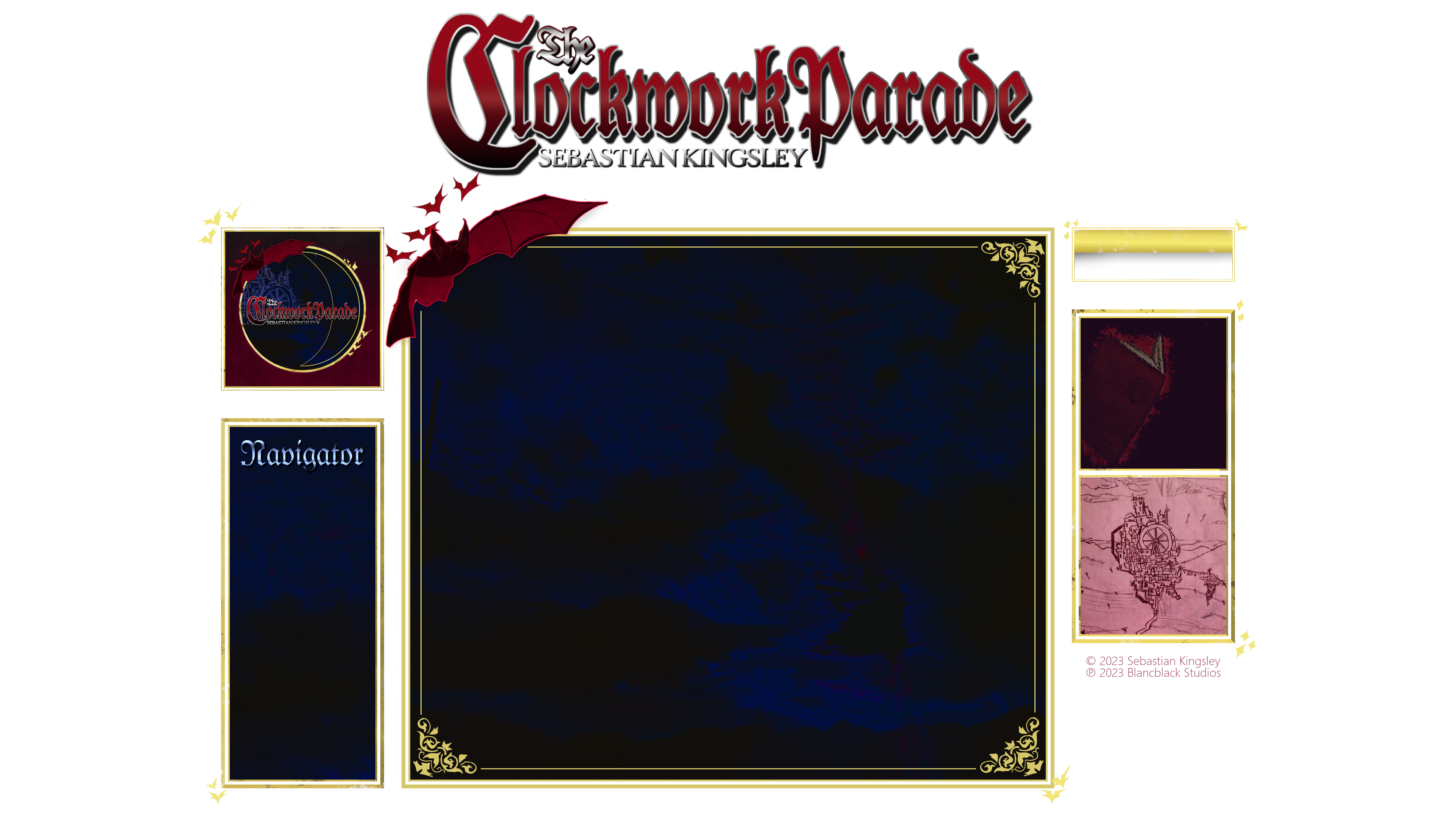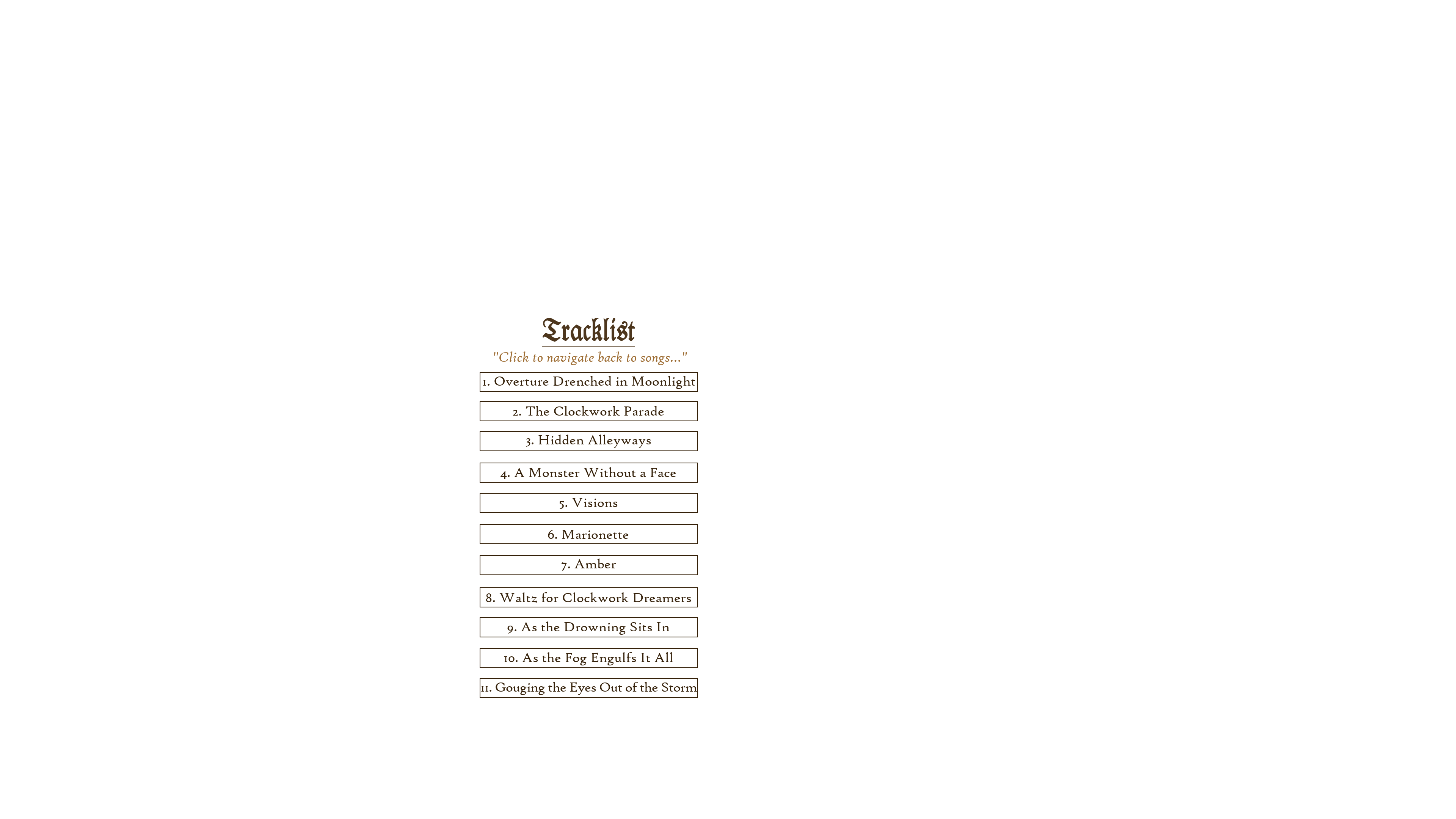 The Clockwork Parade logo Links to listen to The Clockwork Parade Setting Diary, song stories Diary, glossary Character Next Page Next Page (alternative option) Overture Drenched in Moonlight The Clockwork Parade Hidden Alleyways A Monster Without a Face Visions Marionette Amber Waltz for Clockwork Dreamers As the Drowning Sits In As the Fog Engulfs It All Gouging the Eyes Out of the Storm